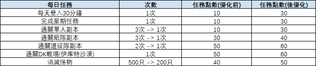 - 每日任務中,部分任務的完成條件將向下調整。