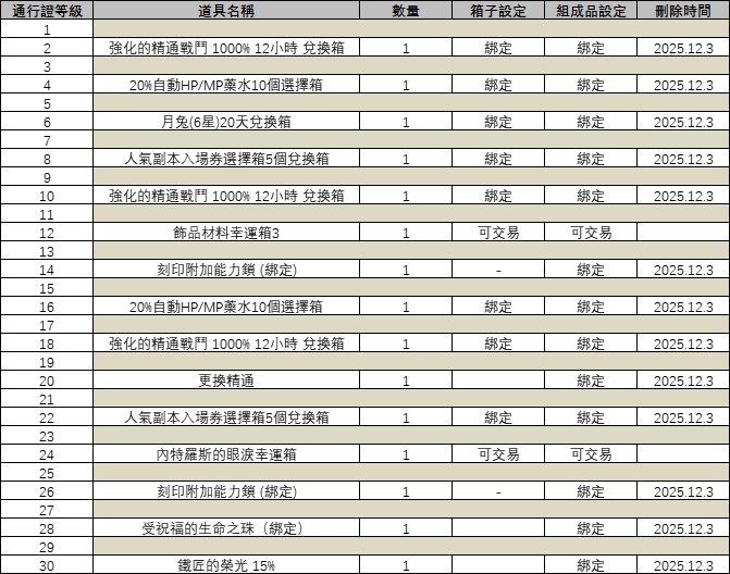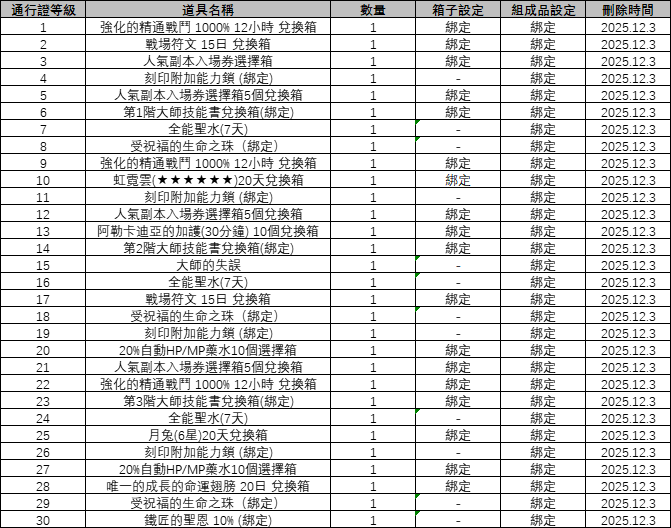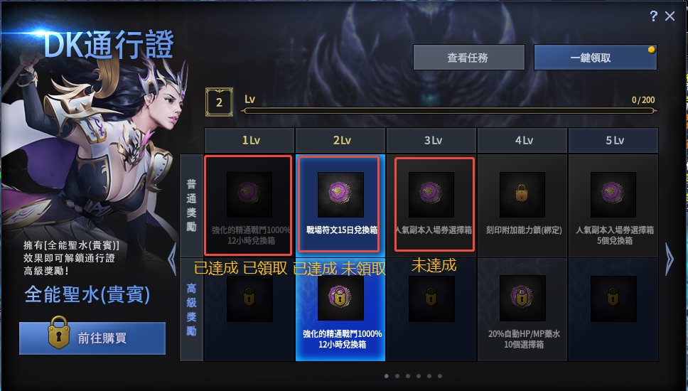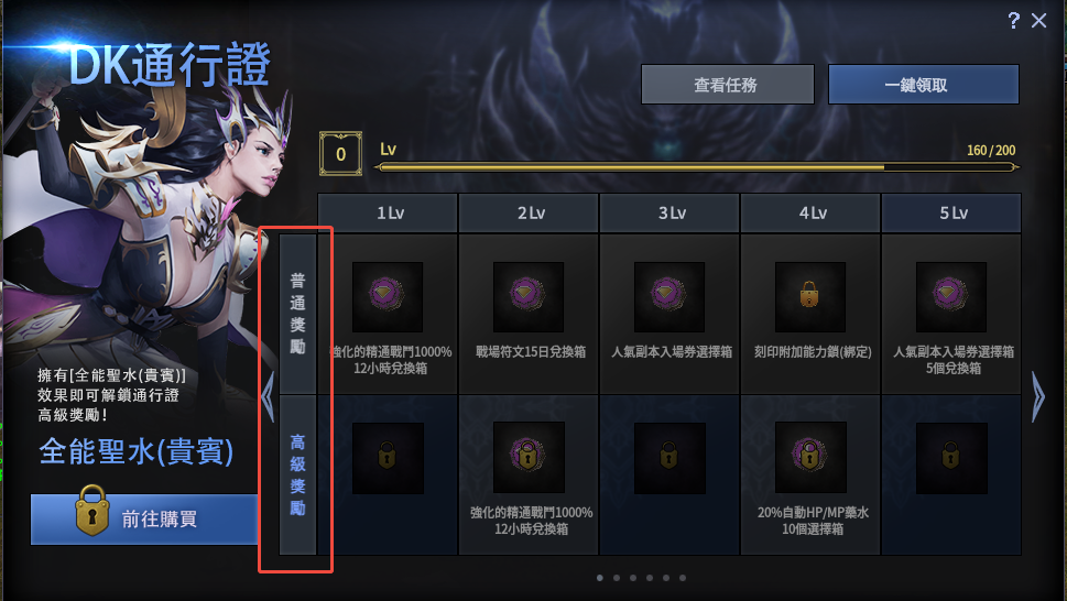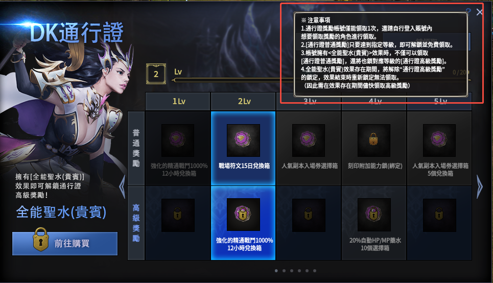 - 角色擁有<全能聖水(貴賓)>效果時,不僅可以領取[普通通行證獎勵],還將也鎖對應等級的[高級通行證獎勵]。