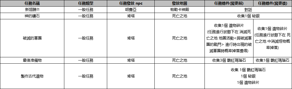 - 為改善進行第二次翅膀連續任務過程中,因遺失古代遺物或無法重新領取而導致任務難以進行的問題,將對任務進行如下修改。
