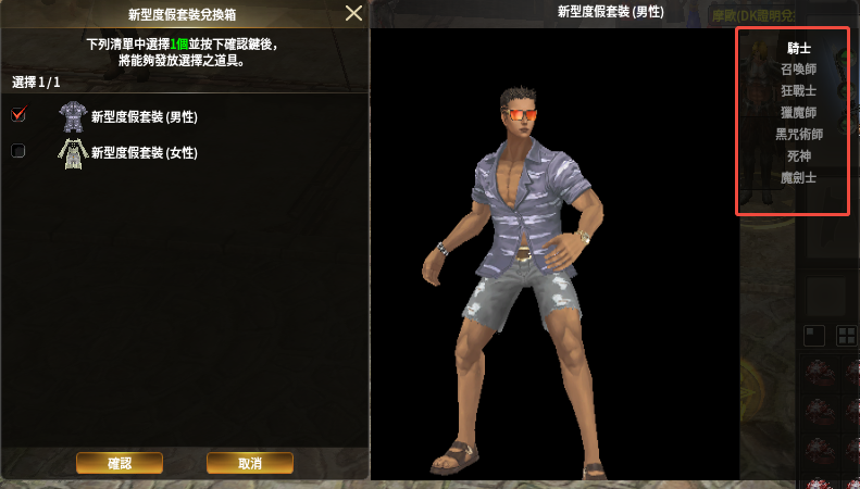 ※ 變更後:左側列表中選擇男/女分類道具後,可在右側預覽窗口選擇職業進行查看。
