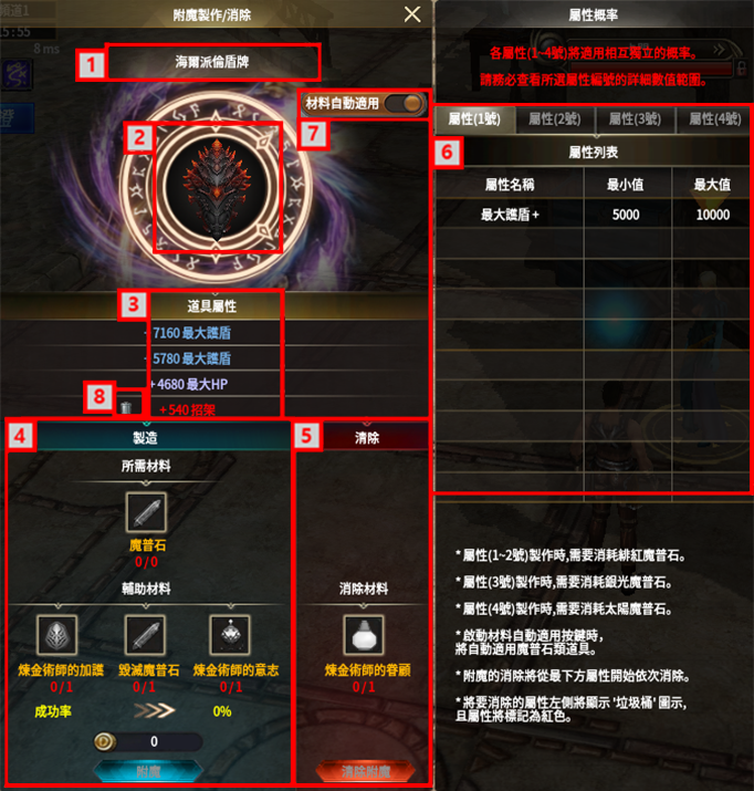 (4)附魔製作所需材料與輔助道具的登錄窗。