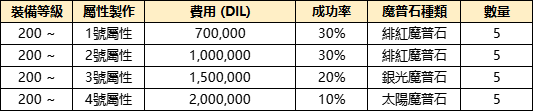 ※ 附魔製作成功時,將獲得對應序號屬性類型與數值範圍內的階級(隨機)屬性1個。
