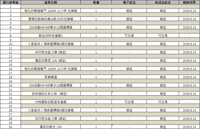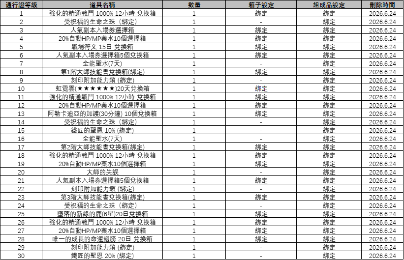 - 角色擁有<全能聖水(貴賓)>效果時,不僅可以領取[普通通行證獎勵],還將也鎖對應等級的[高級通行證獎勵]。