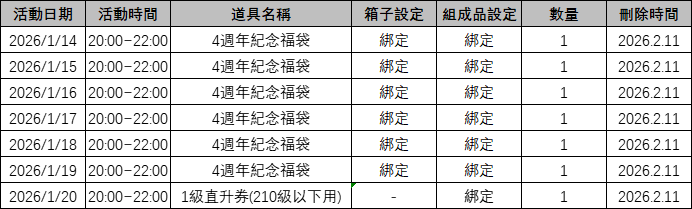 【活動日期】:2026年1月14日 維護後 ~ 2026年1月21日 維護前