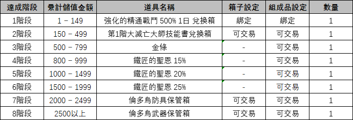 (1)結果纍計儲值最終達成6階段,獲得6階段對應獎勵的【鐵匠的聖恩 25%】1個。