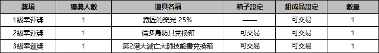 3.以2026年3月18日維護時為准,將統計全體伺服器角色背包中的《倫多烏幸運劵》持有數,並從中抽取3名幸運角色發放幸運獎勵。