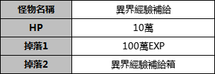 2.活動期間消滅《阿勒卡迪亞[污染],阿勒卡迪亞的地下監獄》地區怪物時,將概率出現《異界經驗補給》。