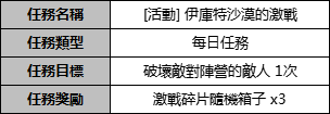 1.活動期間可通過戰地河谷“NPC:傑崙”領取“[活動] 伊庫特沙漠的激戰”任務。