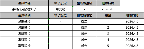 - 以2026年4月1日維護時為准,將統計全體伺服器角色的《激戰碎片》持有數進行幸運星的隨機抽取。