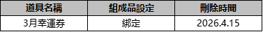 ※ 《3月幸運券 30個兌換箱子》的刪除時間為“2026.4.15維護期間”。