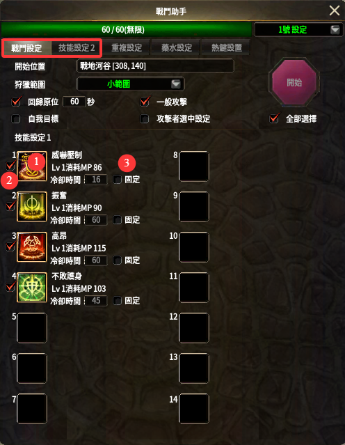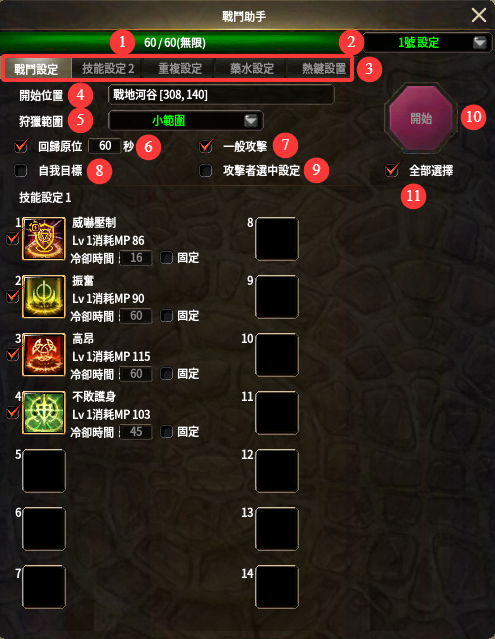- 打開戰鬥助手界面後,可設置戰鬥助手相關功能。