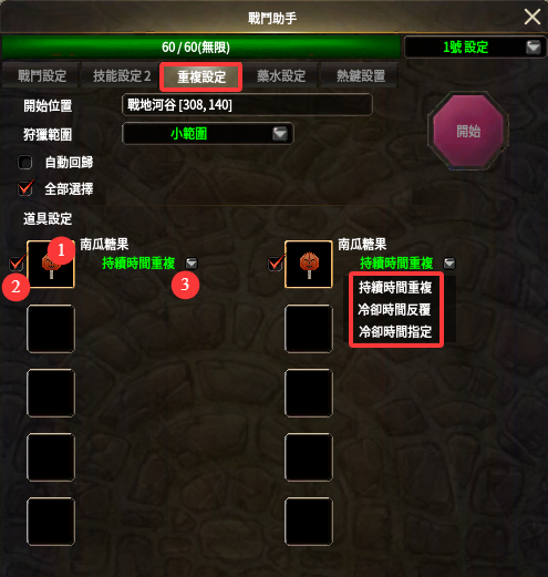 - 指定冷卻時間:可手動設置道具的使用間隔。(不能低於對應道具本身的冷卻時間。)