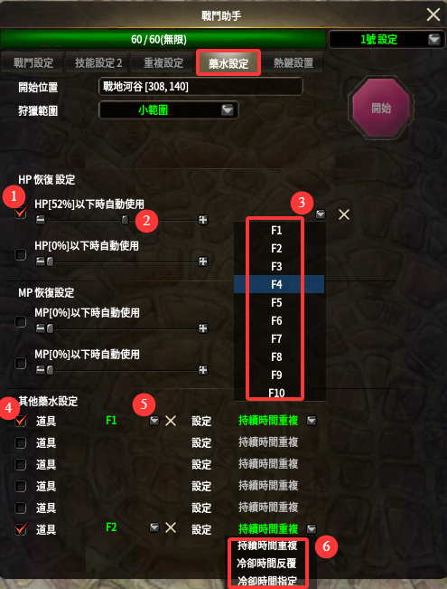 ※ 相較於“遊戲設置- >戰鬥設置”中的藥水自動使用設置,戰鬥助手中的“藥水設定”菜單,可設置非自動藥水的使用。
