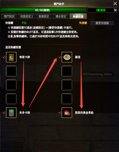 - “熱鍵”的默認快捷鍵為[F11]鍵,點擊1次將自動依次使用,所有登錄在設定區中的BUFF道具。