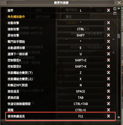 - 快捷鍵變更 -> 角色輔助動作 -> 熱鍵道具使用