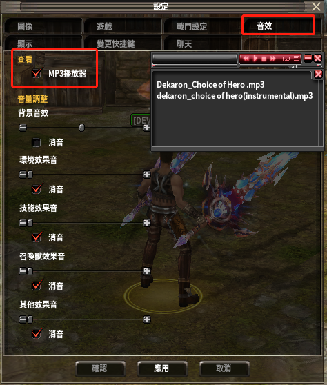 - 可通過勾選“遊戲設置 -> 聲音 -> MP3播放器”,開啟音樂播放器功能。