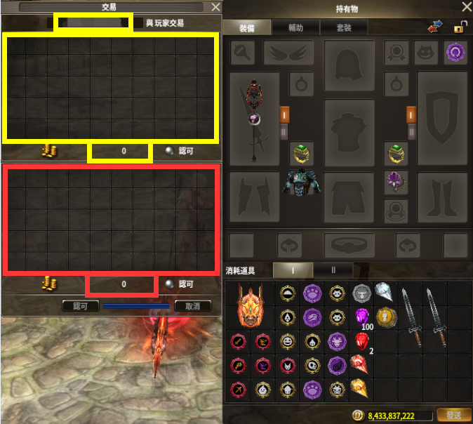 (6)交易目標所添加的道具與DIL將在交易介面上方顯示,我方登錄的道具與DIL將在交易介面下方顯示。