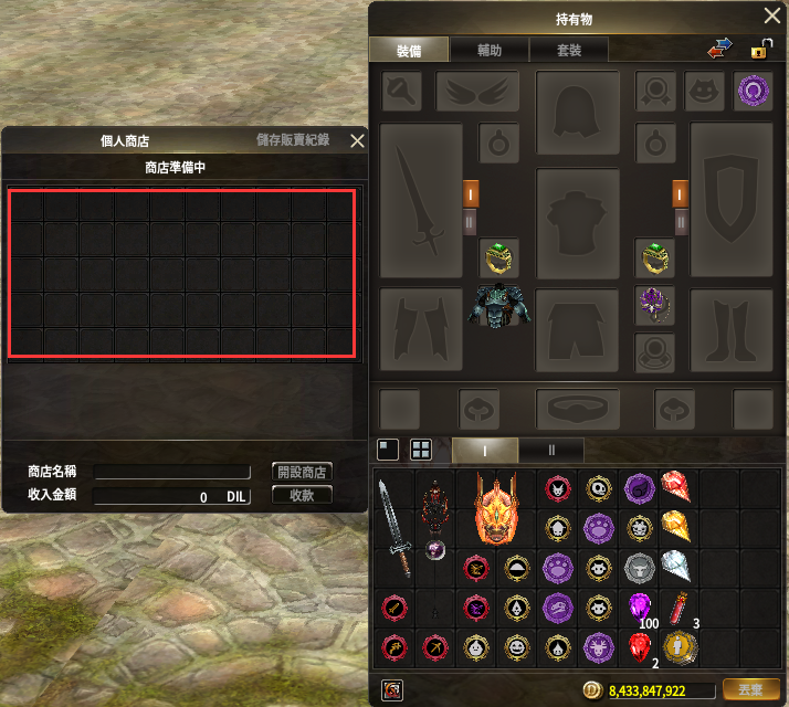 - 擺攤是將可交易型的道具出售給其他玩家從而獲得DIL的功能。(僅能在平靜河谷區域使用擺攤功能。)