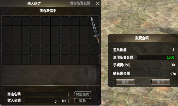 (3)輸入上架道具的單個售價後點擊“確認”時,道具將上架至個人商店中。(個人商店中最多可登錄10種道具。)