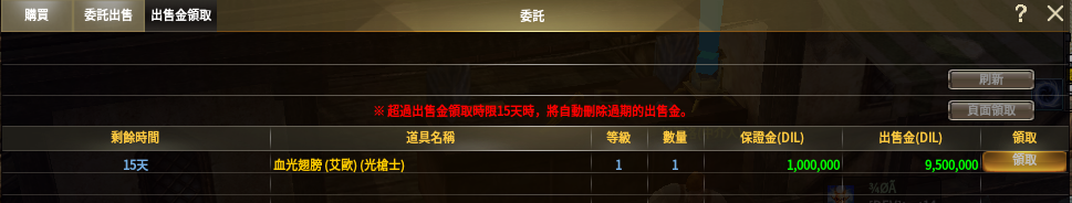 (1)委託出售的道具出售成功後,即可在“出售金領取”界面中領取出售金與保證金。