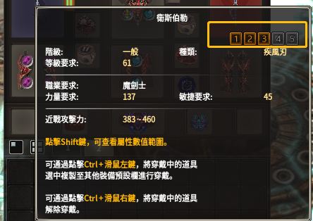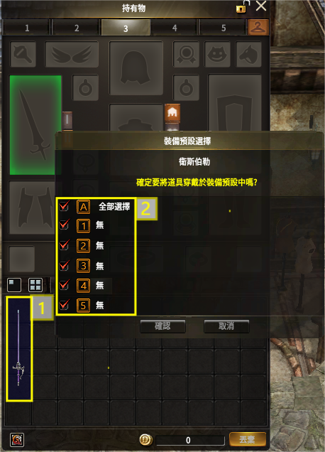 - 角色可使用“1-5號”【裝備預設頁】。(即最多可保存5套裝備組合)