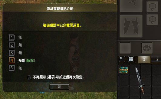 * 原有裝備被解除穿戴時,其他【裝備預設頁】中存在該裝備的穿戴時 -> 該裝備將不會返還至角色背包。