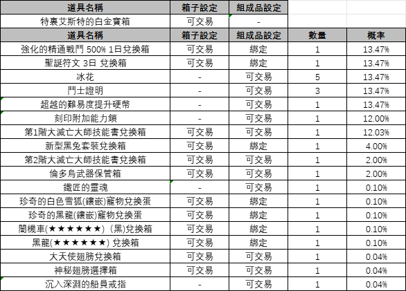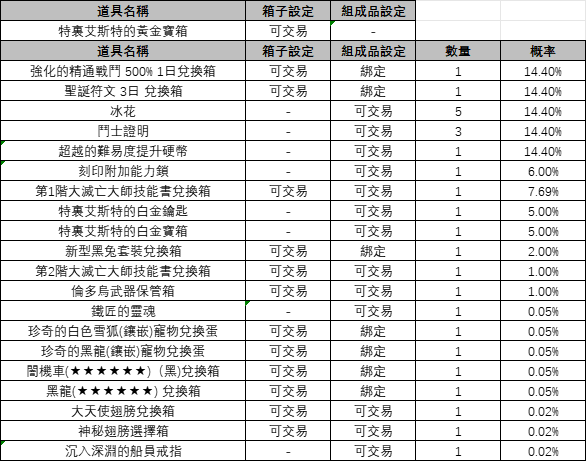概率信息 特裏艾斯特寶箱 《特裏艾斯特寶箱》(2025年10月22日更新) 一、特裏艾斯特的黃金寶箱 ※ 可在組成品中隨機獲得1種。 二、特裏艾斯特的白金寶箱 ※ 可在組成品中隨機獲得1種。 ※ 以上內容僅供參考。