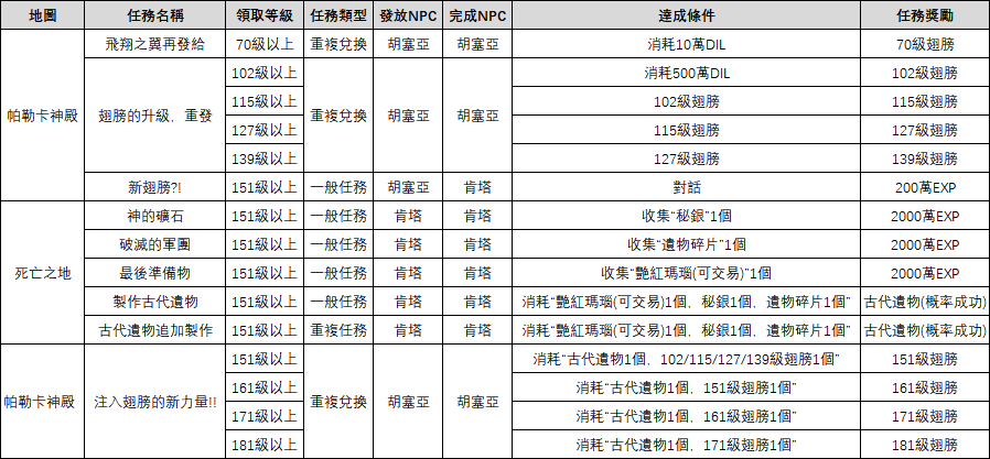 任務 翅膀任務 翅膀任務: ※ 任務道具“秘銀”可通過製作系統“共用 - 其他 - 其他 - 秘銀”中進行製作。 ※ 在已領取“破滅的軍團”或“古代遺物追加製作”的狀態下,可通過消滅“死亡之地”怪物概率獲得“遺物碎片”。 ※ 可通過《古代遺物追加製作》任務額外獲得“古代遺物”道具。 ※ 以上內容僅供參考。