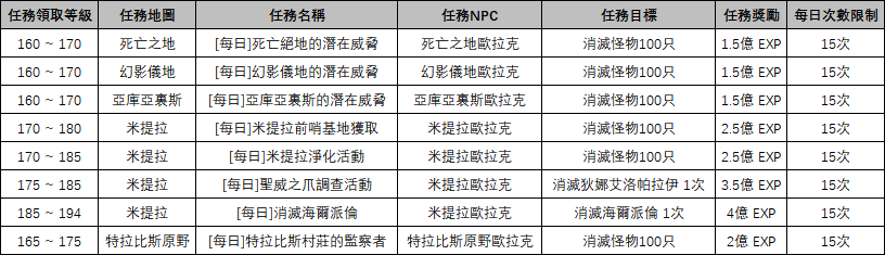 任務 飛級任務 飛級任務: ※ 飛級任務是為160級以上的角色準備的每日重複完成的任務。完成任務時可獲得大量EXP。 ※ 根據任務領取等級限制與當前角色等級,可前往符合的地區領取並完成飛級任務。 ※ 每種重複任務每天僅能完成15次。 ※ 以上內容僅供參考。