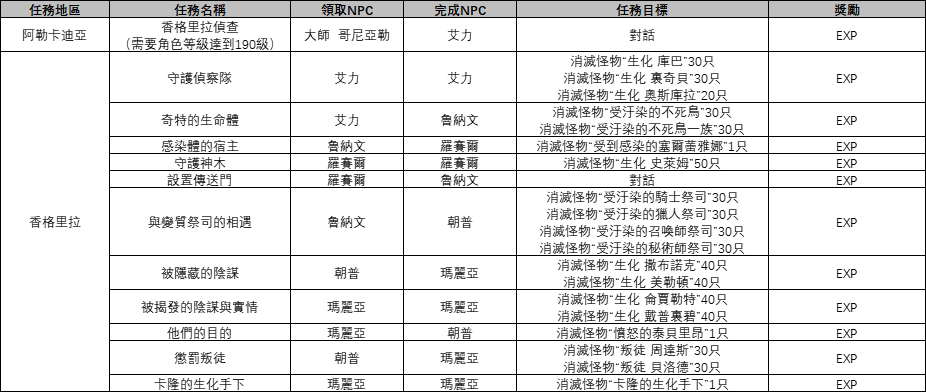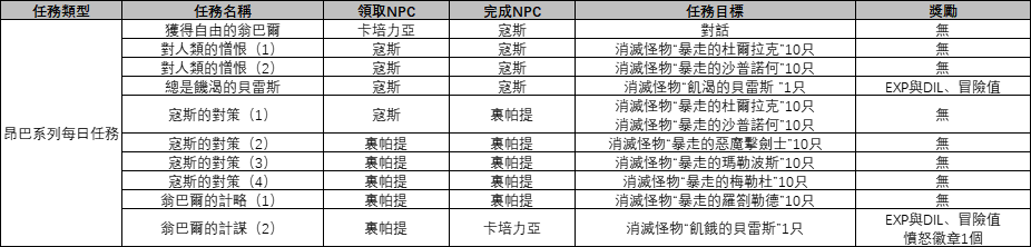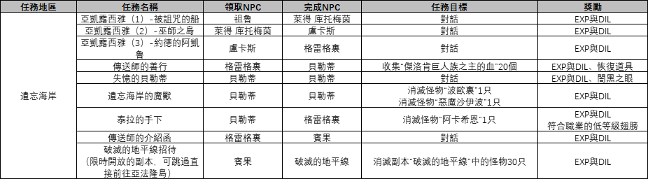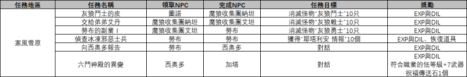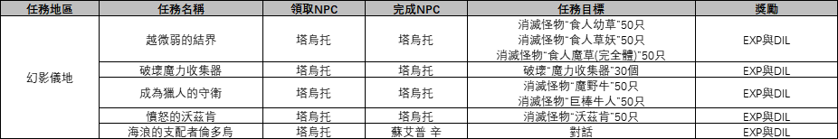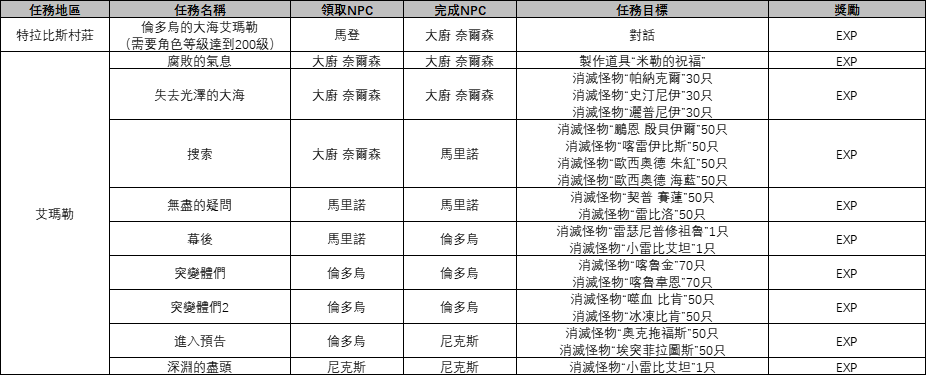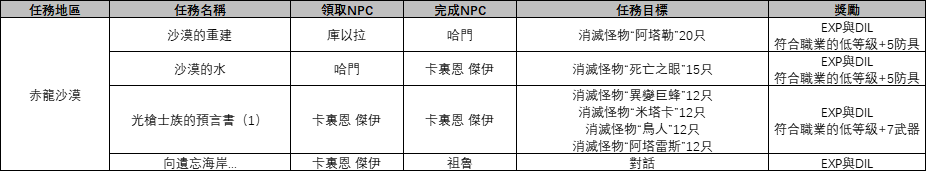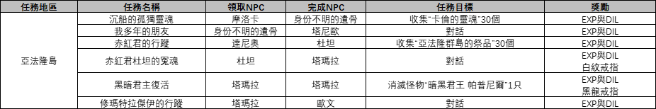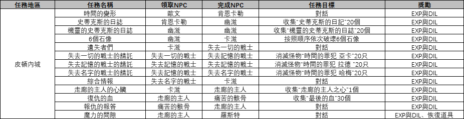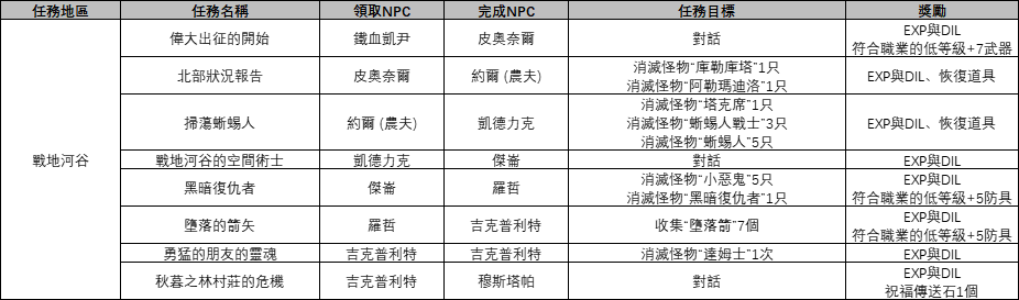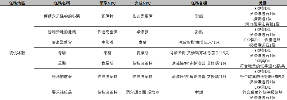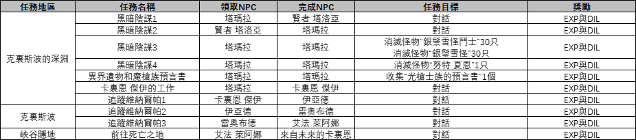 任務 主綫任務 ■ 戰地河谷 ■ 黃昏幽林 ■ 寒風雪原 ■ 帕勒卡神殿 ■ 復仇冰穀 ■ 異教徒洞穴 ■ 赤龍沙漠 ■ 遺忘海岸 ■ 亞法隆島 ■ 皮頓內城 ■ 詛咒迷宮 ■ 阿奎萊斯 ■ 巡禮空間 ■ 克裏斯波 ■ 克裏斯波的深淵 ■ 死亡之地 ■ 昂巴系列每日任務 ■ 崇拜者的安息地 ■ 幻影儀地 ■ 亞庫亞裏斯 ■ 特拉比斯村莊 ■ 米提拉 ■ 香格里拉 ■ 艾瑪勒 ※ 以上內容僅供參考。