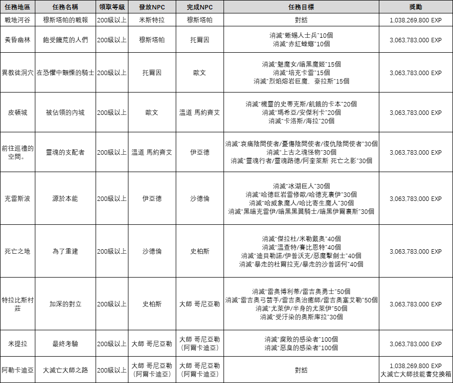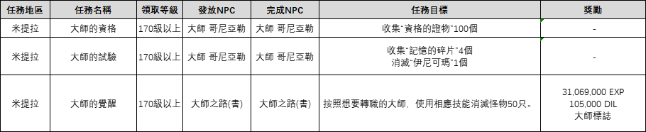 任務 大師任務 一、大師任務: ※ “資格的證物”可通過消滅米提拉任意怪物獲得。 ※ “記憶的碎片”收集與消滅“伊尼可瑪”的目標,可在“塔薩阿卡多”副本中達成。 二、大滅亡大師任務: ※ “腐敗的感染者”與“惡臭的感染者”將在米提拉血紅洞暴走時出現。 ※ 消滅米提拉怪物2萬只時,將會開啟地圖活動血紅洞的暴走。 ※ 以上內容僅供參考。
