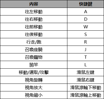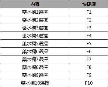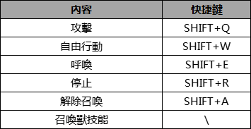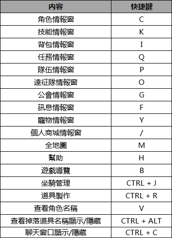 新手指南 快捷鍵使用 一、查看資訊窗口 二、角色主要動作 三、角色輔助動作 四、召喚獸命令 五、技能欄 六、藥水欄 ※ 以上為遊戲默認快捷鍵,玩家更改快捷鍵時將適用更改後的快捷鍵。 ※ 遊戲快捷鍵可通過“ 選項(ESC) -> 遊戲設定 -> 變更快捷鍵”來進行。 ※ 以上內容僅供參考。