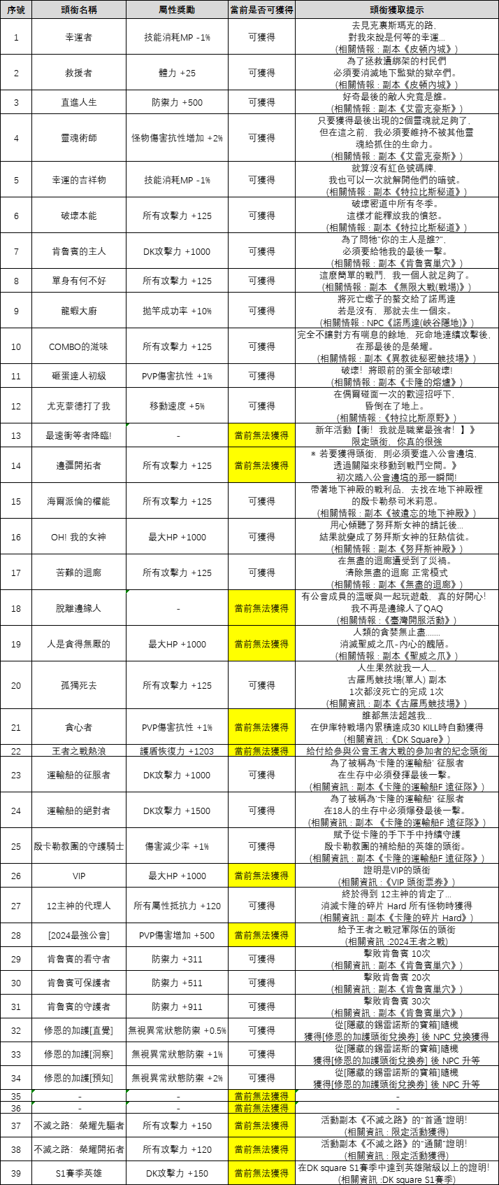 遊戲系統 頭銜系統 一、頭銜介紹 1.遊戲內通過達成特定條件即可獲得頭銜。 2.頭銜可為角色附加額外屬性。 3.角色可選擇頭銜進行佩戴。(角色資訊欄(快捷鍵:C) -> 頭銜) 二、頭銜列表 ※ 以上內容僅供參考。