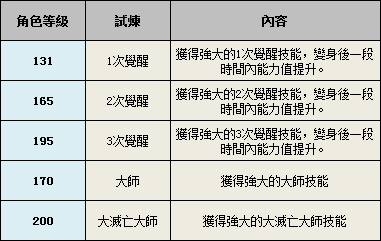 - 通過1次覺醒可習得除變身以外的其他覺醒技能。(其他覺醒技能將在角色等級或等階達成一定條件時自動習得。)