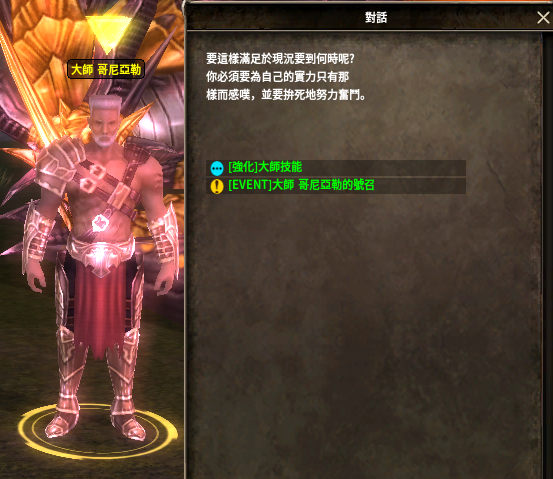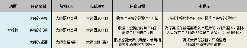 (1)當角色等級達到170級時,即可進行大師的試煉。完成大師時,將會習得移動技能、強大的攻擊技能、同時部分原有技能等級也會擴展。為了獲得更加強大的力量,請前往米提拉尋找“NPC:大師哥尼亞勒”吧。