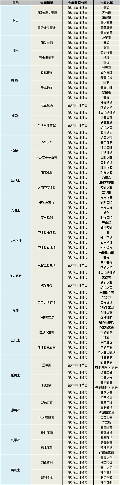 (需要獲得技能書並右鍵使用才能習得技能,部分職業擁有兩個第2階大師技能)
