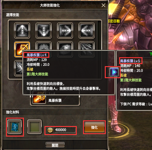 3.在背包中擁有符合職業的特定技能書時,技能強化介面中將顯示強化等級與消耗的DIL。