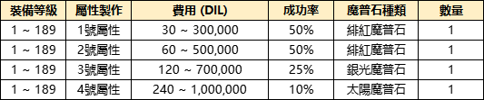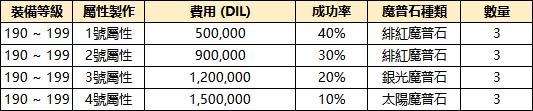 ※ 附魔製作成功時,將獲得對應序號屬性類型與數值範圍內的階級(隨機)屬性1個。