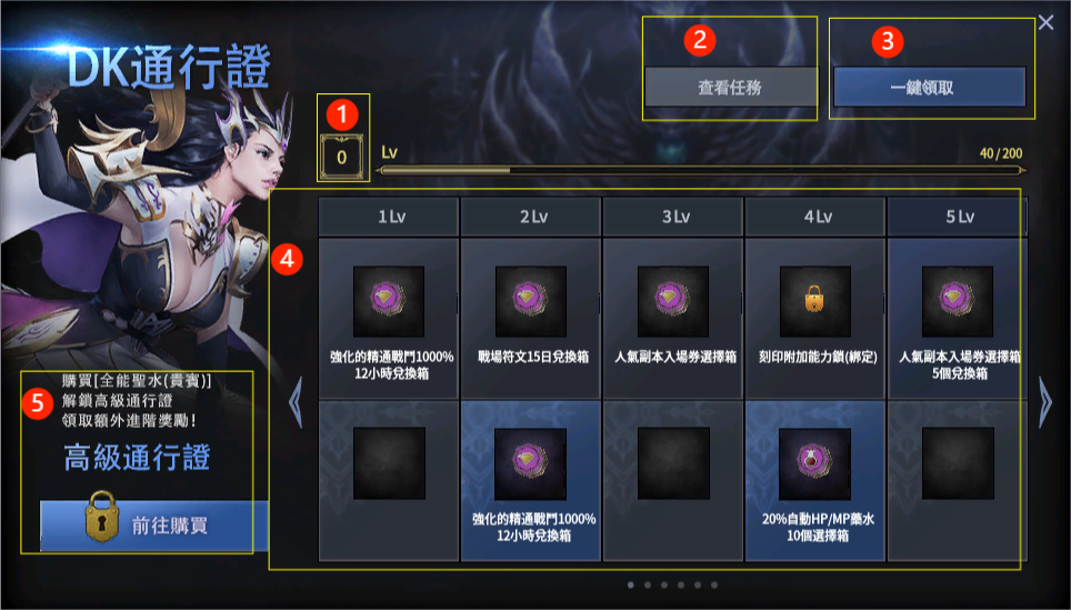 (4) -> 查看[普通/高級]通行證獎勵內容。